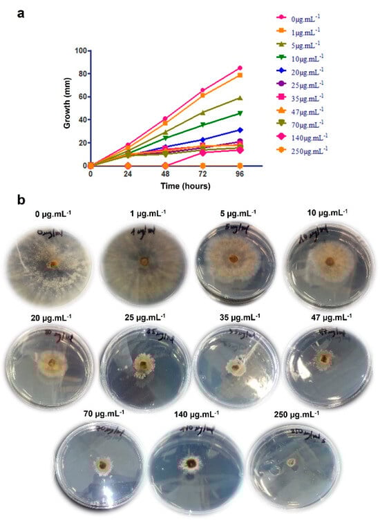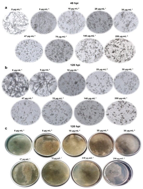 To determine whether the germination inhibition effect was maintained for more than 48 h, the samples were observed under an inverted microscope for 120 h and the same behavior was observed, indicating that the compound remained active for that period of time (Figure 9b).
