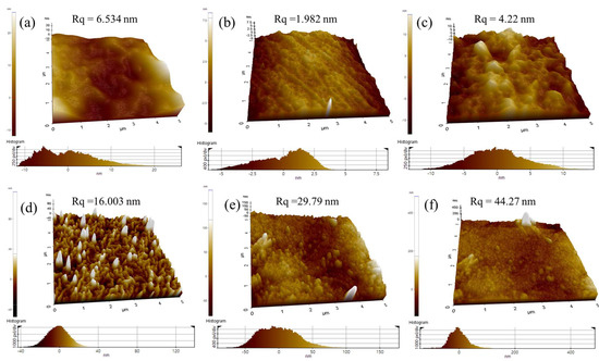 AFM images of (a–c) unsaponified PVAc, PVAc/PULL 90/10, and PVAc/PULL 80/20 films and saponified (d−f) PVAc, PVAc/PULL 90/10, and PVAc/PULL 80/20 films.