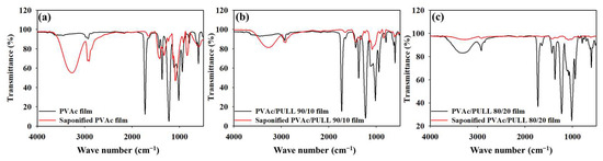 To investigate the structural change in the PVAc/PULL film after heterogeneous saponification, FT-IR analysis was performed. FT-IR data for saponified and unsaponified PVAc/PULL films with various mass ratios of 100/0, 90/10, and 80/20 are shown in Figure 4. According to Figure 4a, asymmetric and symmetric methyl stretch vibration bands of pure PVAc were observed in the range of 2800–2900 cm−1. Meanwhile, the saponified PVAc film showed a –OH stretch in the range of 3000–3600 cm−1 that originated from both intermolecular and intramolecular hydrogen bonds, which meant the acetyl group (–OCOCH3) of PVAc film turned to a hydroxyl group (–OH) due to the reaction with alkaline solution during heterogeneous saponification, which revealed that PVA was obtained from PVAc. A similar result was also found in our previous studies [20,27]. Figure 4b,c also show a similar trend regarding the saponified films, but the peak intensity varied depending on the PVAc/PULL ratio, which might be due to the change in material property. However, when FT-IR spectra of the unsaponified films were considered, Figure 4c shows a very precise broad peak in the range of 3000–3600 cm−1, as PULL also contains the –OH group [28]; it was also revealed that PVA was obtained from PVAc in the presence of PULL.