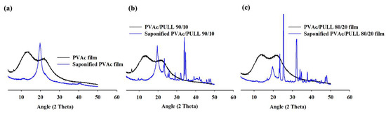 The XRD patterns of unsaponified and saponified PVAc/PULL (100/0, 90/10, and 80/20) films are shown in Figure 5. According to Figure 5, two broad peaks of unsaponified PVAc observed at 13.5° and 22.5° revealed the amorphous characteristics of the pure PVAc film [20]. Meanwhile, the saponified PVAc films showed a sharp crystalline peak at 2θ = 19.8° [19], which is like the characteristic peak of standard PVA, i.e., PVAc was successfully converted to PVA. Similar behavior was observed for the saponified PVAc/PULL (90/10, 80/20) blend films (Figure 5b,c); however, the PVA peak intensity decreased depending on the PVAc content of the blend films. Moreover, various crystalline peaks that appeared for the saponified blend films might be due to the crystallization of PULL during saponification, and their variations with different blend ratios are due to the effect of PULL concentration on PULL crystallization. Similar behavior was observed in another research work, where the crystallization of sucrose occurred when stored in humid conditions [29].