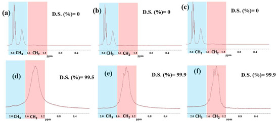 1H-NMR data for (a–c) unsaponified PVAc, PVAc/PULL 90/10, and PVAc/PULL 80/20 films and saponified (d–f) PVAc, PVAc/PULL 90/10, and PVAc/PULL 80/20 films.