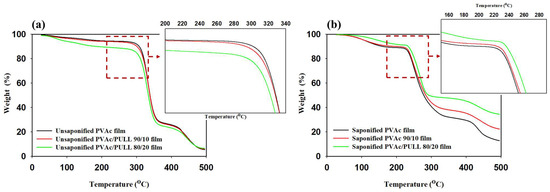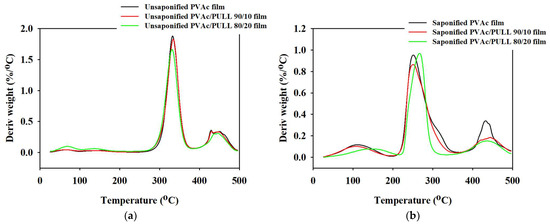 TGA was applied to investigate the dehydration and decomposition of the studied films. Figure 7 and Figure 8 show the TGA and derivative thermogravimetric (DTG) curves of saponified and unsaponified PVAc/PULL (100/0, 90/10, and 80/20) films. According to the figures, all films showed three thermal decomposition stages. The first weight loss occurred in the range of 70–200 °C, and about 7–8% weight loss was due to surface-absorbed water and intermolecular-bound water, which evaporated due to heat [31,32]. The second weight loss for saponified PVAc was about 68%, ending at about 336.24 °C, and the highest weight loss rate that occurred at 220.08 °C might have been due to the break and disintegration of volatile products and dihydroxylation of the saponified PVAc film [33]. The second-stage weight loss for the saponified PVAc/PULL 90/10 blend film was about 61%, beginning at 215.04 °C and ending at 333.84 °C, and the highest weight loss rate was at 251.28 °C. These results proved that the presence of PULL (saponified) could delay the degradation of PVAc (saponified), which might be due to the strong intermolecular bonding as the crystallization of PULL occurred after saponification, as proven by XRD. Compared with the saponified PULL/PVAc 90/10 film, the saponified PULL/PVAc 80/20 film showed a difference at the second-stage weight loss. The decomposition temperature improved, and the weight loss decreased. The third weight-loss area of the saponified PULL/PVAc 80/20 film occurred within the range of 400 °C–495 °C, with a high weight of residue of 34%. Therefore, the saponified PVAc/PULL 80/20 film showed higher thermal stability than other studied saponified films, which might be due to the higher content of crystallized PULL present in the saponified PVAc/PULL 80/20 film. In addition, all unsaponified films showed higher thermal stability than the saponified films; among all unsaponified films, the thermal stability of PVAc decreased with the addition of PULL (Figure 7 and Figure 8), which might be due to the intermolecular breaking and partial disintegration of the molecular structure.