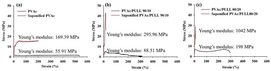 Stress–strain curve for (a) unsaponified and saponified PVAc films, (b) unsaponified and saponified 90/10 PVAc/PULL blend films, and (c) unsaponified and saponified 80/20 PVAc/PULL blend films.