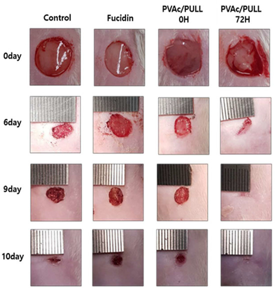 The wound-healing execution of the saponified PVAc/PULL film was explored via an in vivo test. The representative images of wounds and wound-healing profiles on the 0th, 6th, 9th, and 10th days are shown in Figure 10. On the 6th, 9th, and 10th days, the wound contraction for saponified PVAc/PULL film (saponification time = 72 h) groups had the lead over the control group, medicine (Fucidin) group, and unsaponified PVAc/PULL film (saponification time = 0 h) group. Wounds for PVAc/PULL film (saponification time = 72 h) groups were seen to have a closure on the 9th day. In addition, after 10 days, the PVAc/PULL film (saponification time = 72 h) group treated wounds completely, whereas the control group showed a lead over the medicine and PVAc/PULL film (saponification time = 0 h) groups, which remained at the same level. PVA-based wound dressing shows improved performance in wound healing in the presence of drugs [34], whereas our saponified PVAc/PULL film wound dressing has been confirmed to improve the wound-healing process compared with drugs in all healing stages. All studied data demonstrated that the prepared saponified PVAc/PULL films advanced the wound-healing rate compared with other groups (control, Fucidin, and unsaponified PVAc film groups). The saponified PVA/PULL films helped heal wounds very rapidly due to their surface properties, i.e., high surface area-to-volume ratio and extra hydrophilicity due to the presence of PULL, which accelerated the absorption of exudates. A rough surface should be defined as necessary in order to take into account the material’s suitability for wound healing since it enhances the cell’s adhesion to the film because of its flexible cell membrane. Furthermore, the roughness of the film surface affects the bacteria’s ability to attach [35].