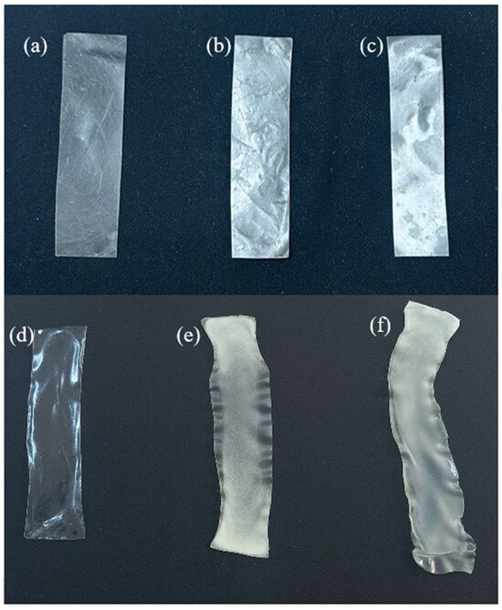 Photographs of (a–c) unsaponified PVAc, PVAc/PULL 90/10, and PVAc/PULL 80/20 films and saponified (d–f) PVAc, PVAc/PULL 90/10, and PVAc/PULL 80/20 films.