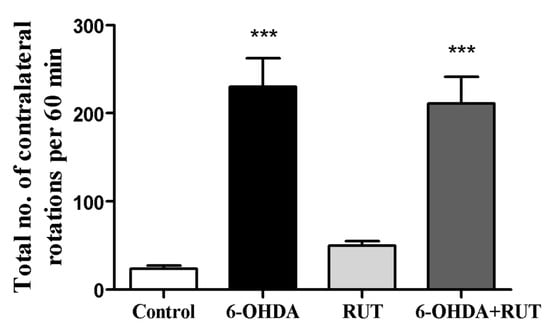 2.3. Rutin Reduces 6-OHDA-Induced Contralateral Deviation