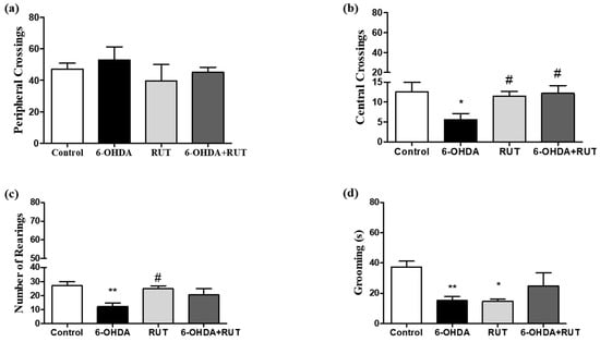 Behavioral damage in Wistar rats treated with 6-OHDA and/or rutin or in control conditions (not treated). Open field test (a–d). Peripheral crossings (a). Center crossings (b). Vertical counts (rearing) (c). Grooming (d). The values show mean ± S.E.M. * and ** indicate p < 0.05 and p < 0.01, respectively, in relation to the control group; n = 8 per group; # indicates p < 0.05 in relation to the 6-OHDA group.