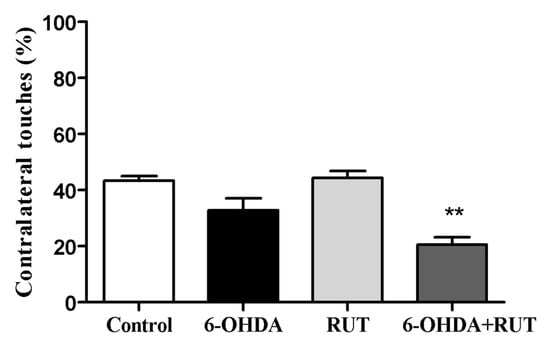 The 6-OHDA-treated animals showed a marked deficit in the use of the contralateral paw compared with the ipsilateral paw (touches with the contralateral paw account for 32.7 ± 4.3% of total touches). The animals that were co-treated with rutin showed an increase in the use of the contralateral paw compared with the ipsilateral paw (20.5 ± 2.7% of total touches). However, the animals that were treated only with rutin presented an increase in the use of the contralateral paw (44.2 ± 2.5) compared to the 6-OHDA-lesioned animals. As expected, the control animals did not present signs of behavioral impairment in the cylinder test (43.3 ± 1.7) (Figure 3).