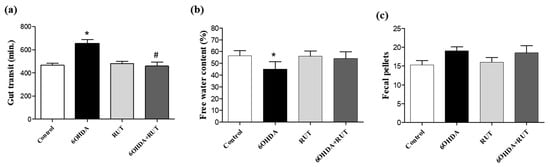 Intestinal transit was altered in parkinsonian rats. Whole gut transit test (a); free water content in the expelled fecal pelotons (b); number of fecal pellets produced by each group (c). The time taken to excrete the head of an orally administered marker (whole gut transit time) was measured. The 6-OHDA group demonstrated a longer gastrointestinal transit time and a lower moisture content in the feces formed. There was no difference in the number of fecal pellets formed between the groups (* p > 0.05, in relation to the control group; # indicates p < 0.05 in relation to the 6-OHDA group). One-Way ANOVA followed by Bonferroni post-test; n = 8 per group).