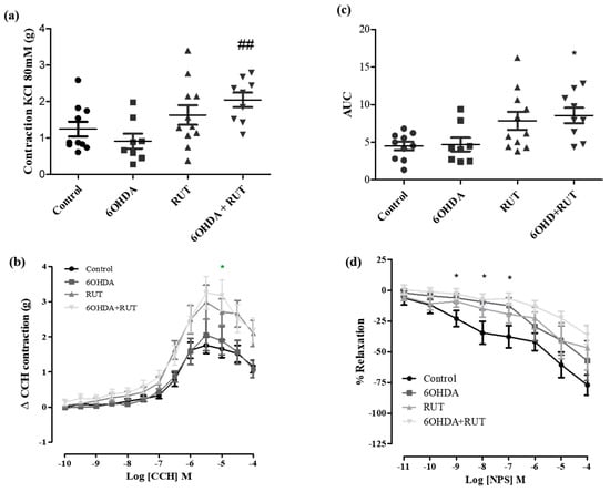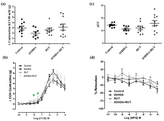 Effect of the treatment with 6-OHDA and/or rutin on colon reactivity. Contraction induced by 80 mM of KCl (g) (a); contraction variation in grams with cumulative concentrations of CCH (10−10–10−4) (b); bar graph with AUC value (area under the concentration–response curve for CCH) (c); percentage of relaxation in cumulative concentrations of NPS (10−10–10−4) (d). Control, 6-OHDA, rutin, and 6-OHDA+rutin group. Values are expressed as mean ± S.E.M. # p < 0.05 (6-OHDA+rutin vs. 6-OHDA). One-way ANOVA followed by Bonferroni post-test; n = 8 per group.