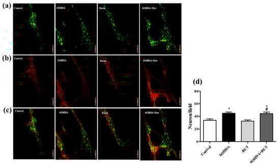 Photomicrographs of the myenteric plexus in the ileum of Wistar rats. Control, 6-OHDA, rutin group, and 6-OHDA+rutin group. (a) Green HuC/HuD neurons. (b) Red S100β glia. (c) Merge. An increase was observed in the number of neurons in the 6-OHDA and 6-OHDA+rutin groups (d). * p < 0.05 (6-OHDA+rutin vs. control) and # p < 0.05 (6-OHDA+rutin vs. 6-OHDA). One-way ANOVA was conducted, followed by Bonferroni post-test; n = 8 per group; scale bar = 100 μm.