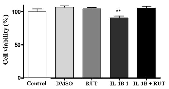 Analysis of cell viability by the MTT test on enteroglial cells. Enteroglial cells were exposed to IL−1β (5 ng mL−1) and untreated or treated with rutin (1 mmol) for 24 h. Cells under control conditions were treated with serum-free DMEM medium or 0.5% DMSO, a vehicle for drug dilution. Results expressed relative to control as 100% (** p < 0.01); n = 8 per group.