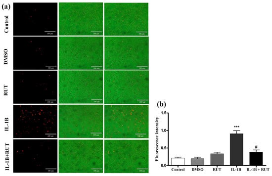 Propidium iodide test (IP). EGCs were exposed to IL-1β (5 ng mL−1) and untreated or treated with rutin (1 mmol) for 24 h. (a) Photomicrographs of cells stained with IP (control, DMSO, rutin, IL-1β, and IL-1β+ rutin). (b) Fluorescence intensity. *** p < 0.001 (IL-1β vs. DMSO) and # p < 0.05 (IL-1β+Rut vs. Rut). One-way ANOVA was conducted, followed by Bonferroni post-test; n = 8 per group.