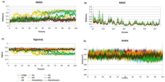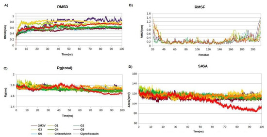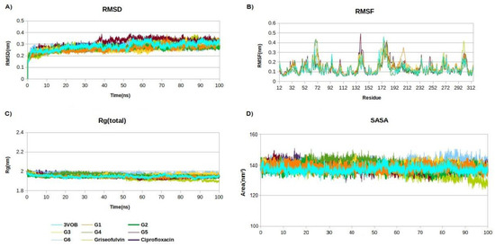 To investigate the antibacterial activity of these designed derivatives and comprehend their potential mechanisms of action, we employed an in silico approach, involving molecular docking, molecular dynamics, and Way2Drugs Prediction of Activity Spectra for Substances (PASS). The prediction relies on analyzing the relationships between structure and activity for over 250,000 biologically active compounds. The overall accuracy of predictions is approximately 95% for the entire PASS training set [34]. In Table 2, the expected biological activities, particularly focusing on the antibacterial and phosphatase inhibitory effects of the griseofulvin derivatives, are presented. In this study, ciprofloxacin served as the reference drug for activity comparisons. Notably, the results reveal that derivative G2 exhibited antibacterial activity surpassing that of ciprofloxacin. Significantly, all the derivatives exhibited noteworthy potential as inhibitors of phosphatase enzymes, a subject that we will investigate more in-depth in this study.