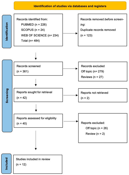 After the deletion of duplicates, 361 studies were screened by evaluating the title and abstract, focusing on the association between precision medicine, genomics, and their implications in oral health. There were 319 articles that did not meet the inclusion criteria (279 off-topic, 27 review, 13 in vitro studies), thus leading to 42 records being selected. Subsequently, 2 records that were non-retrieved were excluded, and then 28 reports were excluded because they did not meet the inclusion criteria (26 off-topic, 2 review). After eligibility, 10 records were selected for qualitative analysis. The selection process and the summary of selected records are shown in Figure 2 and Table 2, respectively.