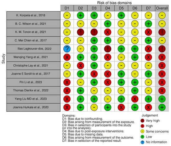 The risk of bias in the included studies is reported in Figure 3. Bias resulting from confounding the majority of studies is a high risk form of bias, while that arising from measurement parameter is a low risk form of bias. Many studies have a low risk of bias due to bias in the selection of participants. Bias due to post-exposure cannot be calculated due to high heterogeneity. Bias due to missing data is low in many studies. Bias arising from measurement of the outcome is low. Bias in the selection of the reported results is high in most studies. The final results show that five studies have a high risk of bias, two have a very high risk of bias, and two have a low risk of bias.