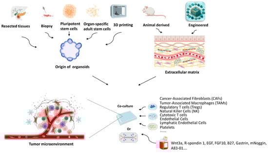 Comprehensive overview of organoid development and tumor microenvironment modeling. The diverse origins of organoids, including resected tissues, biopsies, pluripotent stem cells, organ-specific adult stem cells, and 3D printing techniques are highlighted. The composition of the extracellular matrix (ECM) distinguishes between animal-derived and engineered components. In the context of the tumor microenvironment, the figure showcases the integration of organoids with elements such as culture medium, non-neoplastic cells, and angiogenesis, emphasizing the utility of organoids in replicating complex biological interactions. (Epidermal growth factor, EGF; Fibroblast growth factor 10, FGF10; Mouse Noggin Recombinant Protein, mNoggin; A83-01, Selective inhibitor of TGF-βRI, ALK4, and ALK7).