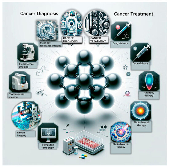 Schematic overview of graphene oxide applications in cancer diagnosis and treatment. Graphene oxide is widely utilized for its unique physical and chemical properties. Surrounding this central structure of GO are various methodologies employed in cancer diagnostics and therapeutics. On the left, diagnostic techniques are showcased: magnetic resonance imaging (MRI), fluorescence imaging, photoacoustic imaging, Raman imaging, and computed tomography (CT), highlighting the multifaceted applications of graphene oxide in enhancing imaging modalities. On the right, treatment approaches are depicted: drug delivery, gene delivery, antibody delivery, photothermal therapy, and photodynamic therapy, indicating the versatility of graphene oxide as a carrier and its role in targeted treatment strategies.