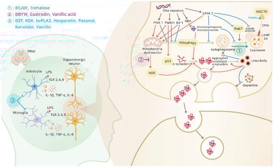 Schematic pathophysiologic mechanism of PD with potential intervention of natural products, the details of which are explained in the following sections. Circled number 1 (green letters), promotion of α-Syn removal through autophagy; circled number 2 (purple letters), inhibition of ROS synthesis from mitochondria dysfunction; circled number 3 (blue letters), inhibition of inflammatory responses from astrocyte and microglia. BSJDF, Bu-Shen-Jie-Du-Fang; DBYW, Da-Bu-Yin-Wan; DZF, Duzhong Fang; KOK, Kyung-Ok-Ko; bvPLA2, bee venom phospholipase A2; SNpc, substantia nigra pars compacta; LPS, lipopolysaccharide; TLR, toll-like receptor; IL, interleukin; TNF-α, tumor necrosis factor α; LRRK2, leucine-rich repeat serine/threonine-protein kinase 2; HSC70, heat shock cognate 71 kDa; ROS, reactive oxygen species; CMA, chaperone-mediated autophagy; LAMP2A, lysosome-associated membrane protein 2a.
