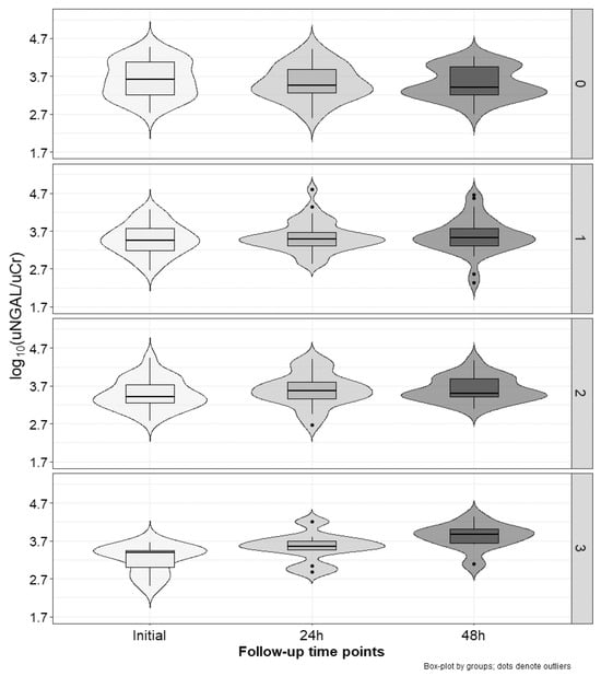 | uNGAL/uCr | Δ0–24 h [%] 2 | 5.2 (−50.3–44.1) | 28.6 (−16.9–63.3) | 42.4 (−23–112.4) | 69.8 (34.5–159) | <0.01 |