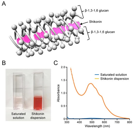 Shikonin has a variety of medical benefits such as wound healing and antitumor effects [], and it is widely applied in creams and ointments because of its high lipophilicity and low water solubility. However, the poor water solubility of shikonin makes it difficult to use as a pharmaceutical raw material or to administer orally []. Therefore, technology has been developed to solubilize shikonin []. In the present study, we used edible β-1,3-1,6 glucan, a polysaccharide found in fungi and seaweeds [,], as an inclusion agent for shikonin, and we successfully prepared a water-soluble shikonin dispersion.