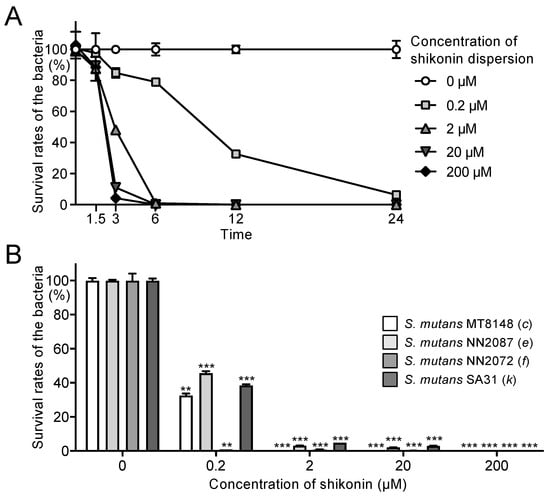 Effects of shikonin dispersion on survival of S. mutans strains suspended in phosphate-buffered saline (PBS). (A) Chronological changes in survival rate of S. mutans MT8148 in the presence of shikonin dispersion. (B) Inhibitory effect of shikonin dispersion after 12 h on the survival of S. mutans strains of different serotypes. Significant differences: ** p < 0.01 and *** p < 0.001 versus no shikonin dispersion.