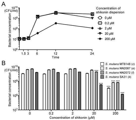 Effects of shikonin dispersion on growth of S. mutans strains cultured in brain–heart infusion (BHI) broth. (A) Chronological changes in the number [in colony-forming units (CFU)/mL] of S. mutans MT8148 in the presence of shikonin dispersion. (B) Inhibitory effect of shikonin dispersion after 12 h on the growth of S. mutans strains of different serotypes. Significant differences: *** p < 0.001 versus no shikonin dispersion.