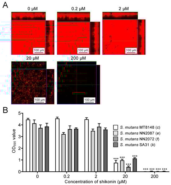 Effects of shikonin dispersion on biofilm formation by S. mutans strains cultured in BHI broth containing 1% sucrose. (A) Representative confocal scanning laser microscopy images of biofilms formed in the presence of shikonin dispersion. The red color indicates biofilm formed by S. mutans. The number above each image indicates the concentration of the shikonin in the dispersion. (B) Quantified levels of biofilm formation of S. mutans strains of different serotypes in the presence of shikonin dispersion. Significant differences: *** p < 0.001 versus no shikonin dispersion.