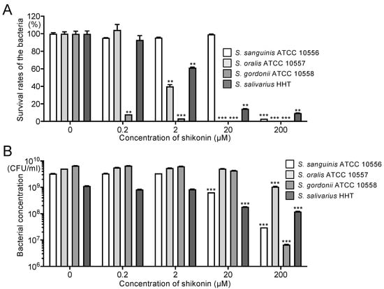 Effects of shikonin dispersion on non-mutans streptococci. (A) Inhibitory effects of shikonin dispersion after 12 h on non-mutans streptococci suspended in PBS. (B) Inhibitory effects of shikonin dispersion after 12 h on growth of non-mutans streptococci cultured in BHI broth. Significant differences: ** p < 0.01 and *** p < 0.001 versus no shikonin dispersion.