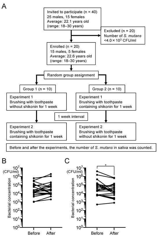 Changes in the number of S. mutans in saliva before and after using toothpaste with and without shikonin dispersion. (A) Flow diagram of the clinical study. (B,C) The number of S. mutans (in CFU/mL) before and after brushing with toothpaste with no shikonin dispersion for 1 week (B) and before and after brushing with toothpaste containing shikonin dispersion for 1 week (C). Significant differences: * p < 0.05.