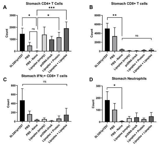 - Becher, D.; Deutscher, M.E.; Simpfendorfer, K.R.; Wijburg, O.L.; Pederson, J.S.; Lew, A.M.; Strugnell, R.A.; Walduck, A.K. Local recall responses in the stomach involving reduced regulation and expanded help mediate vaccine-induced protection against Helicobacter pylori in mice. Eur. J. Immunol. 2010, 40, 2778–2790. [Google Scholar] [CrossRef]