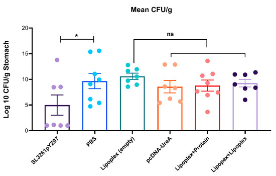 | F | Lipoplex-A | UreA protein | 50 µg DNA + 100 µg SLN-A, 50 µg UreA protein (boost) | ✓ |