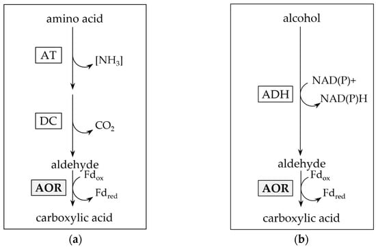 Figure 1. Putative function of aldehyde:ferredoxin oxidoreductase (AOR) in aldehyde detoxification. Reductive detoxification of accumulated aldehydes as product of amino acid ((a); after [17,18]) or alcohol catabolism ((b); after [14,19]). AT: aminotransferase; DC: decarboxylase; ADH: alcohol dehydrogenase.