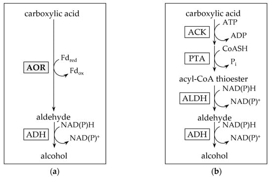 Figure 2. Pathways for enzymatic carboxylic acid reduction. (a) Aldehyde:ferredoxin oxidoreductase and alcohol dehydrogenase involving (AOR-ADH) pathway for direct reduction of carboxylic acids to alcohols. Note that the pathway also reduces acetate produced from pyruvate oxidation in sugar fermentation. (b) Activation of carboxylic acids through acetate kinase (ACK) and phosphotransacetylase (PTA) to their acyl-CoA thioesters, and subsequent reduction by aldehyde dehydrogenase (ALDH) and ADH.