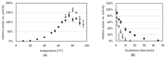 Figure 4. Temperature-dependent aldehyde oxidation activity of AORX514. (a) AOR activity was measured between 10 °C and 90 °C (dark grey circles) and between 65 °C and 95 °C (grey triangles) as acetaldehyde-dependent reduction of BV (ε600 = 7.4 mM−1 cm−1). The reaction mixture contained in 50 mM TRIS, pH 7.5 with 1.2 mM BV, 12 µg (dark grey circles) or 15 µg (light grey squares) AORX514 and 1.2 mM acetaldehyde. AOR-His from two independent purifications was used, the average represents four technical replicates. The specific activities were normalized to the mean value of the activity at 65 °C. (b) Thermostability of AOR at 65 °C (dark grey circles), 75 °C (grey triangles) and 85 °C (light grey squares). AOR activity was measured in 50 mM TRIS with 2.4 mM benzyl viologen, 14 µg AOR-His and 1.2 mM acetaldehyde at 65 °C. The average represents three to five experiments, activities were normalized to the enzyme activity before heat treatment.