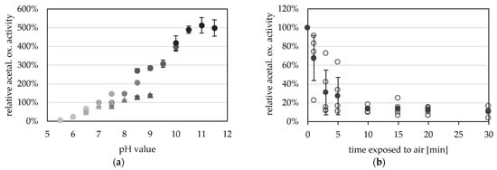 Towards its pH optimum, acetaldehyde oxidation was observed at pH 5.5 (0.5 U mg−1) and increased activities up to pH 11.5 (36.3 U mg−1) (Figure 5a). A higher pH optimum for the aldehyde oxidation reaction has generally been reported for all AORs. However, the ideal pH for archaeal AORs from Pyrococcus furiosus and Thermococcus strain ES-1 is overall higher (pH 11 to 12) [2,13] than the ideal pH of bacterial AORs such as AOR from Aromatoleum aromaticum and Clostridium formicoaceticum (pH 8 to 10) [5,12,16].