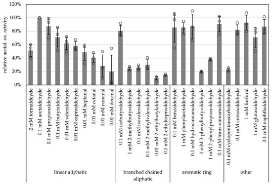 Carboxylic acid reduction by microorganisms has gained attention in industry such as for bio-based polymers and production of alcohols as biofuels [42]. And, due to their broad substrate spectra, AORs have become more interesting for these applications. Along these lines, we tested a wide range of aldehydes as substrates. All of the supplied aldehydes, such as short-chained aliphatic (e.g., acetaldehyde, propionaldehyde) branched-chained aliphatic (e.g., isobutyraldehyde), aromatic (e.g., benzyaldehyde, phenylacetaldehyde, hydrocinnamaldehyde, trans-cinnamaldehyde) as well as unsaturated (crotonaldehyde), heterocyclic aldehydes (furfural) and naphthaldehyde were oxidized with comparably high specific activities (>80% of the activity with acetaldehyde, Figure 6 and Table S3). Although acetaldehyde was the best substrate tested, longer chained aldehydes such as nonanal and decanal were also oxidized (28% and 20% of activity towards acetaldehyde, respectively). Generally, AORX514 showed a lower specific activity with branched-chained aldehydes than with the linear aldehyde, e.g., 71% butyraldehyde and 62% valeraldehyde versus 26% for isovaleraldehyde. For AORX514 a wide variety of substrates were tested, also in comparison to other AORs, but overall, the high activity with short-chained linear aldehydes and short-chained aromatic aldehydes has also been described for other AORs, such as AOR from Aromatoleum aromaticum (AORAa) [16] and AOR from Peptoclostridium acidaminophilum (formerly Eubacterium acidaminophilum) [9]. Interestingly, furfural, which is toxic to most microorganisms and is a side product of pretreatment and hydrolysis or lignocellulosic feedstock and a problem in industrial wastewater [43,44], was oxidized.