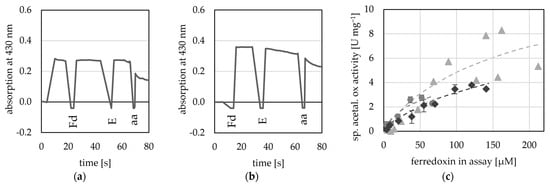 To determine the ferredoxin-dependency, benzyl viologen was replaced by 4 to 200 µM His-TKV_c16450, His-TKV_c09620, His-TKV_c10420 and His-TKV_c19530 from T. kivui [48]. The reduction of ferredoxin was measured at 430 nm, and the activity was calculated as micromoles aldehyde oxidized per minute per milligram protein, under the assumption that His-TKV_c16450 transports one electron and His-TKV_c09620 transports two electrons.