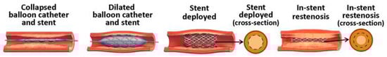 Additionally, due to the restenosis of the treated artery following balloon deflection, BMSs were introduced in the 1990s to address this flaw in ballooning and line the artery wall. Between 1991 and 2003, this reduction in restenosis to 20–30% was made possible by eliminating elastic recoil. But BMSs had a disadvantage: it was a foreign object to the immune system, which could respond to this intrusive object in various ways. For example, white blood cells known as macrophages could accumulate around the stent, and nearby smooth muscle cells (SMCs) could proliferate and obstruct the endothelialization process. The luminal region narrows after vascular SMCs move from the media to the intima, multiply, and form an additional layer of cellular matrix there (intimal hyperplasia). Likely, the leukocytes that stick to the activated endothelium and prevent it from healing cause thickened intima []. These undesirable processes eventually lead to in-stent restenosis (shown in Figure 1).