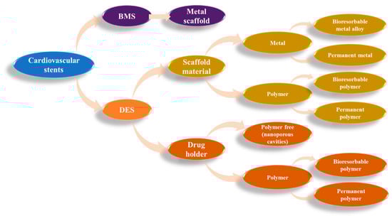 Scientific progress is being made to address this issue. These procedures, which date back around 40 years, are still being refined today: balloon angioplasty, bare stent, drug-eluting stent, and bioresorbable stent. The many stents are compiled from the material perspective in Figure 2 [].