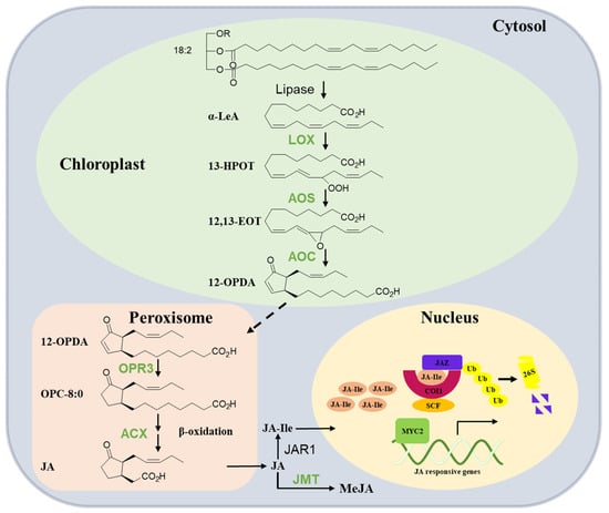 The synthesis of JA was initially elucidated by Vick and Zimmermann [16]. Subsequent investigations and reviews have extensively summarized the pathway for JA biosynthesis in plants. Therefore, this section offers a brief summary of our current knowledge (Figure 1). JA production is completed by a multi-step enzymatic process that occurs sequentially in the chloroplast, peroxisome, and cytoplasm. The fatty acid substrate of JA originates from the release of α-linolenic acid 18:3 (α-LeA) from galactolipids in chloroplast membranes. Then, the pathway is initiated by the lipoxygenase (LOX)-catalyzed oxygenation of α-LeA. The LOX product 13(S)-hydroperoxy-octadecatrienoic acid (13-HOPT) is converted by allene oxide synthase (AOS), leading to the generation of an unstable allene oxide, 12,13(S)-epoxy-octadecatrienoic acid (12,13-EOT). The subsequent enzyme, allene oxide cyclase (AOC), cyclizes 12,13-EOT to produce the 9S, 13S isomer of 12-oxo-phytodienoic acid (12-OPDA), which is the final product of the chloroplast-located part of JA biosynthesis. The next steps take place in the peroxisome, where OPDA is activated and reduced to 10,11-dihydro-12-oxo-phytodienoic acid (OPC-8:0) by 12-oxo-phytodienoatereductase isoenzyme 3 (OPR3). This reaction is followed by fatty acid b-oxidation enzyme acyl-CoA oxidase (ACX1), yielding (+)-7-iso-JA, which rearranges into the (−)-JA isomer (with molar ratio of 9:1 for (−)-JA/(+)-7-iso-JA). In the cytosol, free JA can be further metabolized into a series of metabolites. For example, it can be conjugated with isoleucine to form JA-Ile by jasmonate-amido synthetase (JAR1) and methylated to the methyl ester of JA (MeJA) by JA carboxyl methyltransferase (JMT). JA-Ile is the bioactive form of JA that is recognized by the JA receptor complex [6,16,17,18,19].