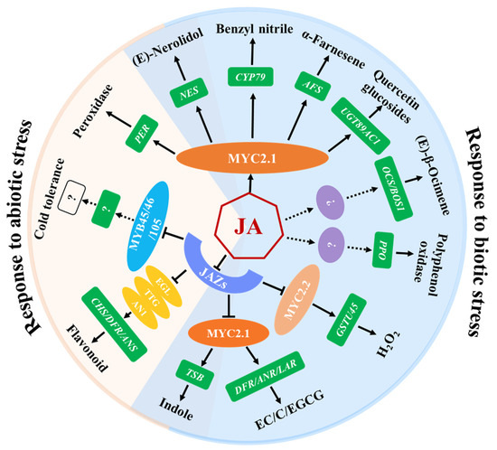 Due to the frequent occurrence of extreme weather conditions, cold stress and high temperature have become two of the most destructive factors in tea plant cultivation. They adversely affect the growth and development of tea plants, leading to negative impacts on the tea industry. Physiological and biochemical assays have shown that the exogenous application of MeJA effectively improves the tolerance of tea plants to cold stress by promoting reactive oxygen species (ROS) scavenging under cold stress conditions. The transcriptional expression levels of CsMYB45, CsMYB46, and CsMYB105 were found to be strongly induced when exposed to a combination of MeJA and cold stress treatment. Furthermore, the exogenous application of MeJA amplified the expression of CsMYB45, CsMYB46, and CsMYB105 in E. coli and improved the growth and survival rates of recombinant cells compared to those with empty vectors under cold stress. Yeast two-hybrid (Y2H) and bimolecular fluorescence complementation (BiFC) experiments confirmed the interaction of CsMYB46 and CsMYB105 with CsJAZ3, CsJAZ10, and CsJAZ11. All results indicate that CsMYB45, CsMYB46, and CsMYB105 are essential components that influence the response to cold stress through the JA signaling pathway [52]. High temperatures significantly decrease the flavonoid content in tea leaves, while JA partially counteracts the suppression of catechin metabolites caused by high temperature. CsHSFA1a and CsHSFA2 are master regulators in the heat stress response, and they directly bind to the cis-element of the CsJAZ6 promoter and activate the transcription of CsJAZ6. CsJAZ6 could represses catechin biosynthesis by directly interacting with CsEGL3 and CsTTG1, and the silencing of CsJAZ6 in tea leaves causes the upregulation of almost all genes involved in flavonoid biosynthesis and a decrease in catechin content. These findings suggest that JA serves as a central regulator mediating the regulatory effect of high temperature on the flavonoid synthesis pathway [76].