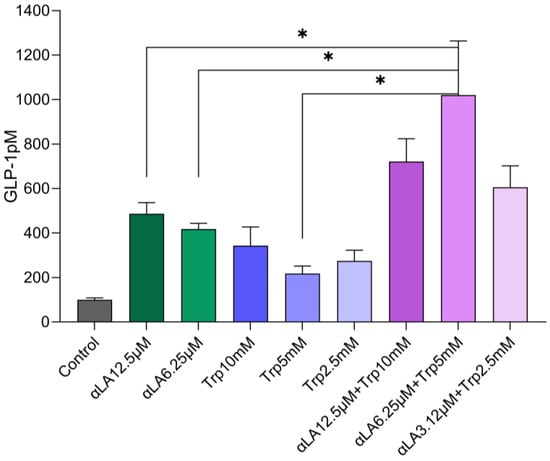 αLA (6.25–12.5 µM), Phe (6.25–25 mM), and Trp (2.5–10 mM) dose-dependently stimulated GLP-1 secretion in STC-1 cells (Figure 1). αLA (12.5 µM) significantly stimulated GLP-1 secretion ~5-fold and αLA (6.25 µM) ~4-fold, compared with the buffer (control). Similarly, Trp (2.5–10 mM) stimulated GLP-1 secretion ~2–3.5-fold compared with the control. Interestingly, the combination of αLA (6.25 µM) and Trp (5 mM) significantly (~2.5-fold) increased GLP-1 secretion compared with either αLA (6.25 µM) or Trp (5 mM) individually. In addition, the combination of αLA (6.25 µM) and Trp (5 mM) significantly increased GLP-1 secretion compared with a higher dose of αLA (12.5 µM). Higher-dose combinations of αLA (12.5 µM) and Trp (10 mM) and lower-dose combinations αLA (3.125 µM) and Trp (2.5 mM) increased GLP-1, but not statistically significantly, compared with individual nutrients (Figure 1).