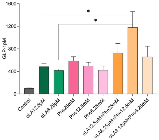 αLA (12.5 µM) significantly stimulated GLP-1 secretion compared with the control. The combination of αLA 6.25 µM and L-phenylalanine (Phe) (12.5 mM) increased GLP-1 secretion compared with individual nutrients. The values represent the mean ± standard error of mean (SEM), and differences were considered statistically significant when p < 0.05 and n = 6 (* p < 0.05).