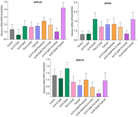 αLA, Phe, and Trp, and their combinations, increased mRNA gene expression of GPR120 and GPR40 compared with the control (Figure 3).
