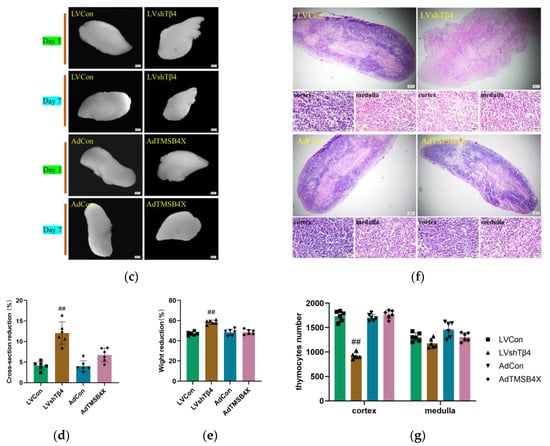 Impact of Tβ4 on thymus morphology, structure, and cell number. (a) Representative images of thymocytes overflow in LVCon, LVshTβ4, AdCon, and AdTMSB4X groups. Scale bar = 50 μm; (b) Statistical results of (a); (c) Representative images of the thymus captured with a stereo microscope in LVCon, LVshTβ4, AdCon, and AdTMSB4X groups. Scale bar = 250 μm; (d) Maximum cross-section reduction of thymus (%) in LVCon, LVshTβ4, AdCon, and AdTMSB4X groups; (e) Wight reduction of thymus (%) in LVCon, LVshTβ4, AdCon, and AdTMSB4X groups; (f) H&E representative images of thymus in LVCon, LVshTβ4, AdCon, and AdTMSB4X groups. Scale bar = 250 μm (upper), 50 μm (lower); (g) The counting area for the lower image in (f). Statistical results of cortical and medullary thymocyte numbers in LVCon, LVshTβ4, AdCon, and AdTMSB4X groups. One-way ordinary ANOVA tests were used in (b,d,e), and a two-way ANOVA test was used in (g). Each symbol represents a separate data point. Data for (b,d,e,g) are presented as mean ± SEM from at least three independent experiments. Statistical significance was determined by comparing it with the LVCon group (## p < 0.01).