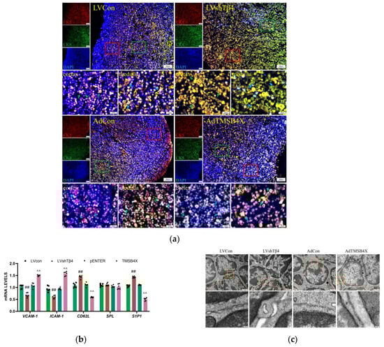 To gain further insights into the potential role of Tβ4 in thymocyte maturity and migration, we examined the mRNA levels of key factors involved in these processes within thymic tissue. Notably, vascular cell adhesion molecule-1 (VCAM-1), intercellular cell adhesion molecule-1 (ICAM-1), L-selectin (CD62L), SQUAMOSA promoter binding protein-like (SPL) transcription factor, and sphingosine1-phosphate receptor 1 (S1P1) were analyzed, with S1P1 and CD62L being crucial factors mediating cell migration [,]. RT-qPCR analysis revealed that compared with the LVCon group, the LVshTβ4 group exhibited significantly decreased mRNA levels of VCAM-1 and ICAM-1, while CD62L and S1P1 levels were significantly increased. Conversely, compared with the AdCon group, the AdTMSB4X group displayed significantly increased mRNA levels of VCAM-1 and ICAM-1, with a simultaneous decrease in CD62L and S1P1 levels (Figure 3b). It can be preliminarily speculated that the decrease of VCAM-1 and ICAM-1 in the thymus of the LVshTβ4 group may lead to the decrease of adhesion and interaction between thymocytes and TECs, while the increase of CD62L and S1P1 may enhance the migration and localization ability of thymocytes. The AdTMSB4X group was the opposite.