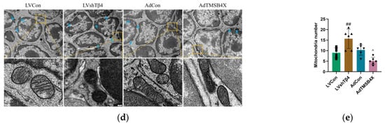 The reticular structure of TEC is vital for the development and selection of thymocytes in the thymus. This intricate network is not solely formed by TECs themselves but rather through interactions between TECs, other cell types, and the extracellular matrix. To assess the impact of Tβ4 on cell interactions in the thymus, we injected 10 μL lentivirus or adenovirus into the chest from the center of the first pair of ribs. Thymus organs were then removed on the 7th-day post-injection and observed using a transmission electron microscope. The results revealed that thymocytes in the LVCon group, AdCon, and AdTMSB4X groups displayed smooth cell membranes. In contrast, the cell membrane surface of the LVshTβ4 group exhibited small protrusions between cells (Figure 3c). Regarding mitochondrial morphology, the LVCon group, AdCon, and AdTMSB4X groups predominantly displayed a short stick shape, while the LVshTβ4 group exhibited mostly spherical mitochondria (Figure 3d).