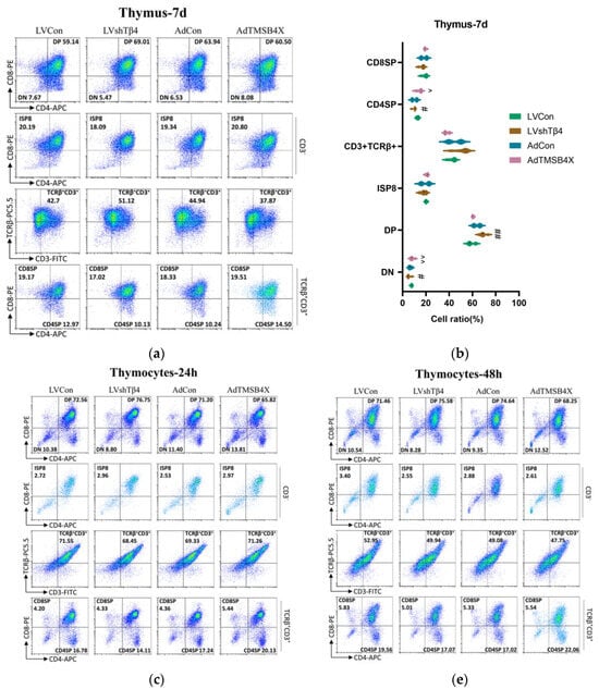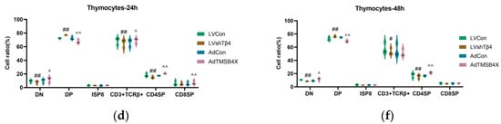 Subsequently, we isolated thymocytes and cultured them for 24 h and 48 h, respectively. The results from the isolated thymocytes were consistent with the above findings from the cultured thymus. After 24 h culture, significant differences were observed in CD4−CD8−, CD4+CD8+, CD3+TCRβ+, and CD3+TCRβ+CD4+CD8− subsets. In comparison with the LVCon group, the LVshTβ4 group exhibited a significant decrease in the proportion of CD4−CD8−, CD3+TCRβ+, and CD3+TCRβ+CD4+CD8− by 15.18%, 3.91%, and 15.88%, respectively, while the proportion of CD4+CD8+ was significantly increased by 5.77%. To the contrary, compared with the AdCon group, the AdTMSB4X group showed a significant increase in the proportion of CD4−CD8−, CD3+TCRβ+, and CD3+TCRβ+CD4+CD8− by 21.16%, 2.76%, and 16.08%, respectively, while the proportion of CD4+CD8+ was significantly decreased by 7.56% (Figure 4c). The statistical results are depicted in Figure 4d.