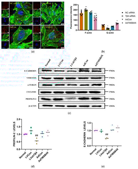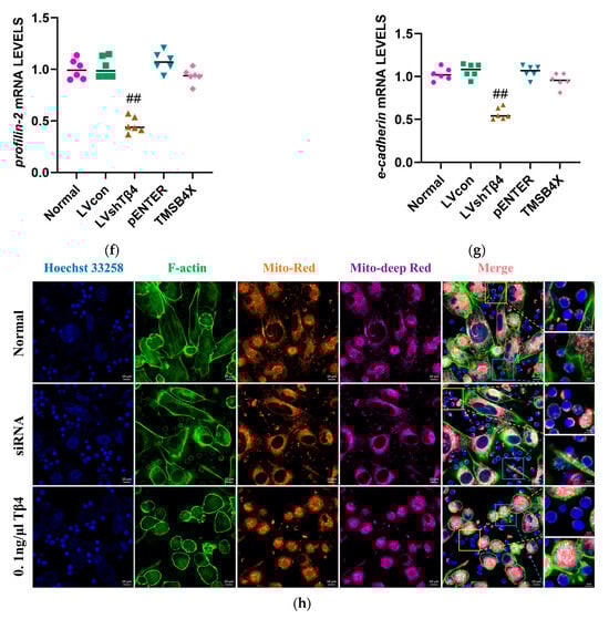 Subsequently, we investigated the levels of cytoskeleton-related proteins, including PROFILIN-2, CYCLIND1, α-TUBLIN, VIMENTIN, and E-CADHERIN, through Western Blot (Figure 5c). The results demonstrated that, in comparison with the LVCon group, the LVshTβ4 group exhibited a significant decrease in PROFILIN-2 and E-CADHERIN levels of 43.57% and 50.06%, respectively (Figure 5d,e). These findings were further validated by RT-qPCR, which showed a consistent reduction in the mRNA levels of profilin-2 and e-cadherin in the LVshTβ4 group, with a decrease of 55.77% and 50.35%, respectively (Figure 5f,g). Sosne et al. emphasized that Tβ4 stimulated in vitro conjunctival epithelial cell migration and resulted in altered focal adhesion formation []. Aleksandra et al.’s research indicated that Tβ4 was not only a component of focal adhesions (FAs) and interacted with several FAs components but also regulated FAs formation []. Therefore, when Tβ4 is knocked down, the adhesion ability of cells to the matrix might be affected, resulting in the reduction of cell adhesion and migration. PROFILIN-2 and E-CADHERIN were proteins associated with cell adhesion and migration [,], and their decline might be the result of decreased cell adhesion and migration ability. When Tβ4 was over-expressioned, it might lead to excessive enhancement of cell adhesion and migration, resulting in abnormal cell behavior. The decline in PROFILIN-2 and E-CADHERIN might be the result of excessive enhancement of cell adhesion and migration, and cells might exhibit abnormal adhesion and migration behavior.